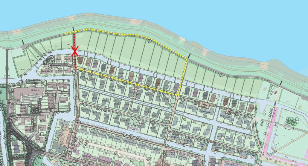 Vanaf woensdag 28 september 2024 worden er werkzaamheden uitgevoerd ten behoeve van de brug ten westen van Westbatterijlaan 40. Het tijdelijke pad wordt hiervoor afgesloten, zie rood aangegeven locatie in de onderstaande afbeelding.