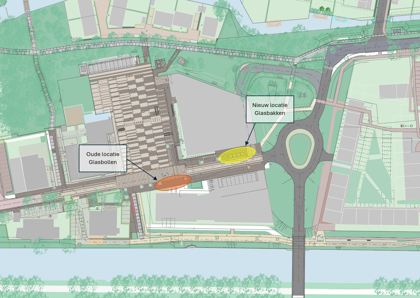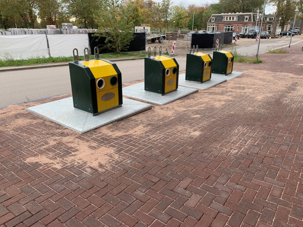 Onlangs zijn de 3 stuks tijdelijke glasbollen nabij de nieuwe Albert Heijn vervangen voor 4 stuks definitieve ondergrondse glascontainers. De containers staan aan de overzijde van de weg, zie onderstaande afbeelding.