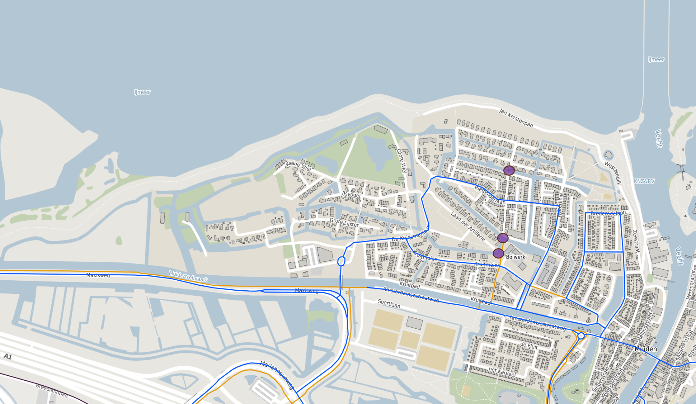 Daarnaast worden er 3 zoutbakken geplaatst bij de fietsbruggen Eerste Kringpad-Muyderban-Oude Molen-Laan der Artillerie, zie paars weergeven locaties op de onderstaande afbeelding.