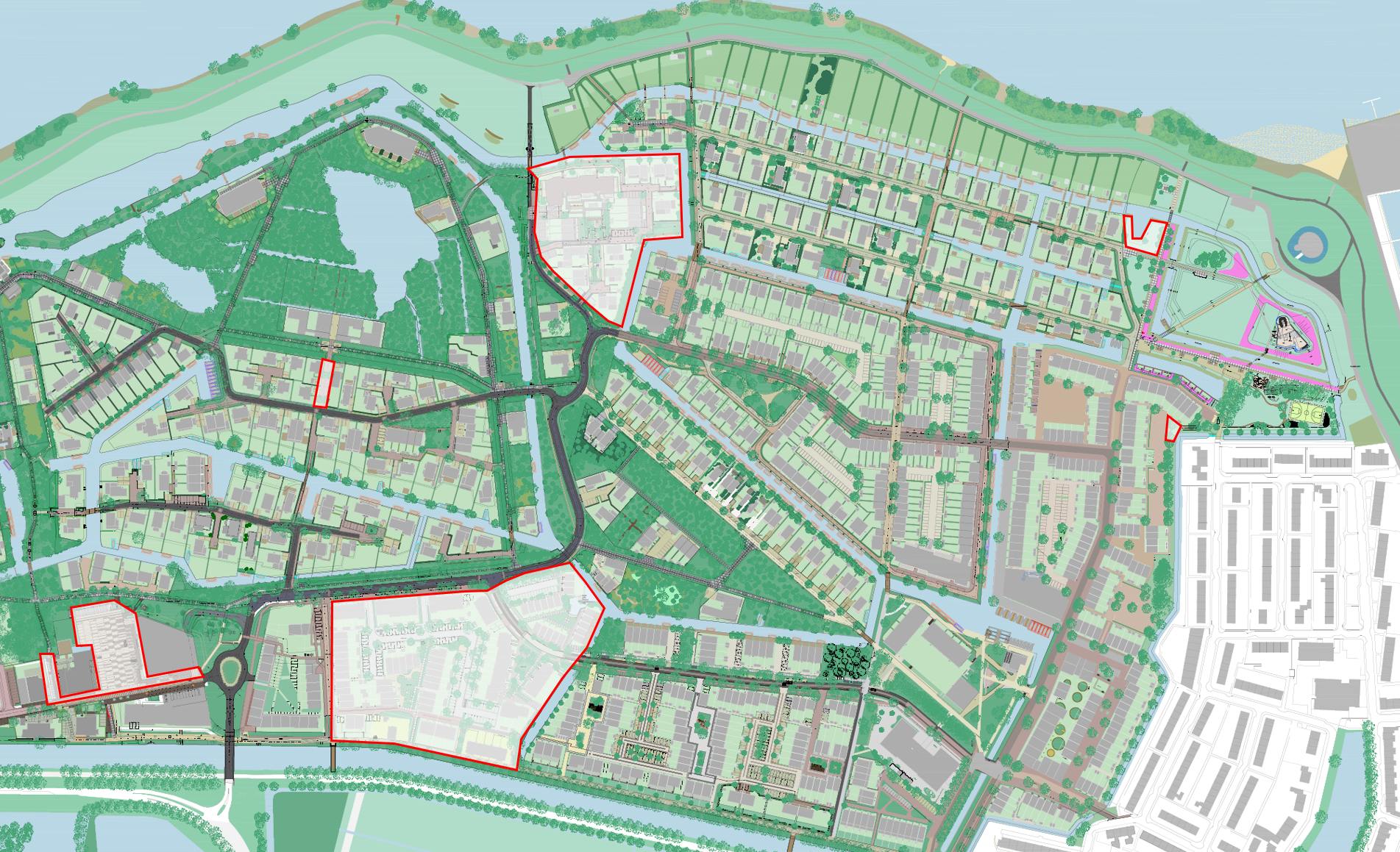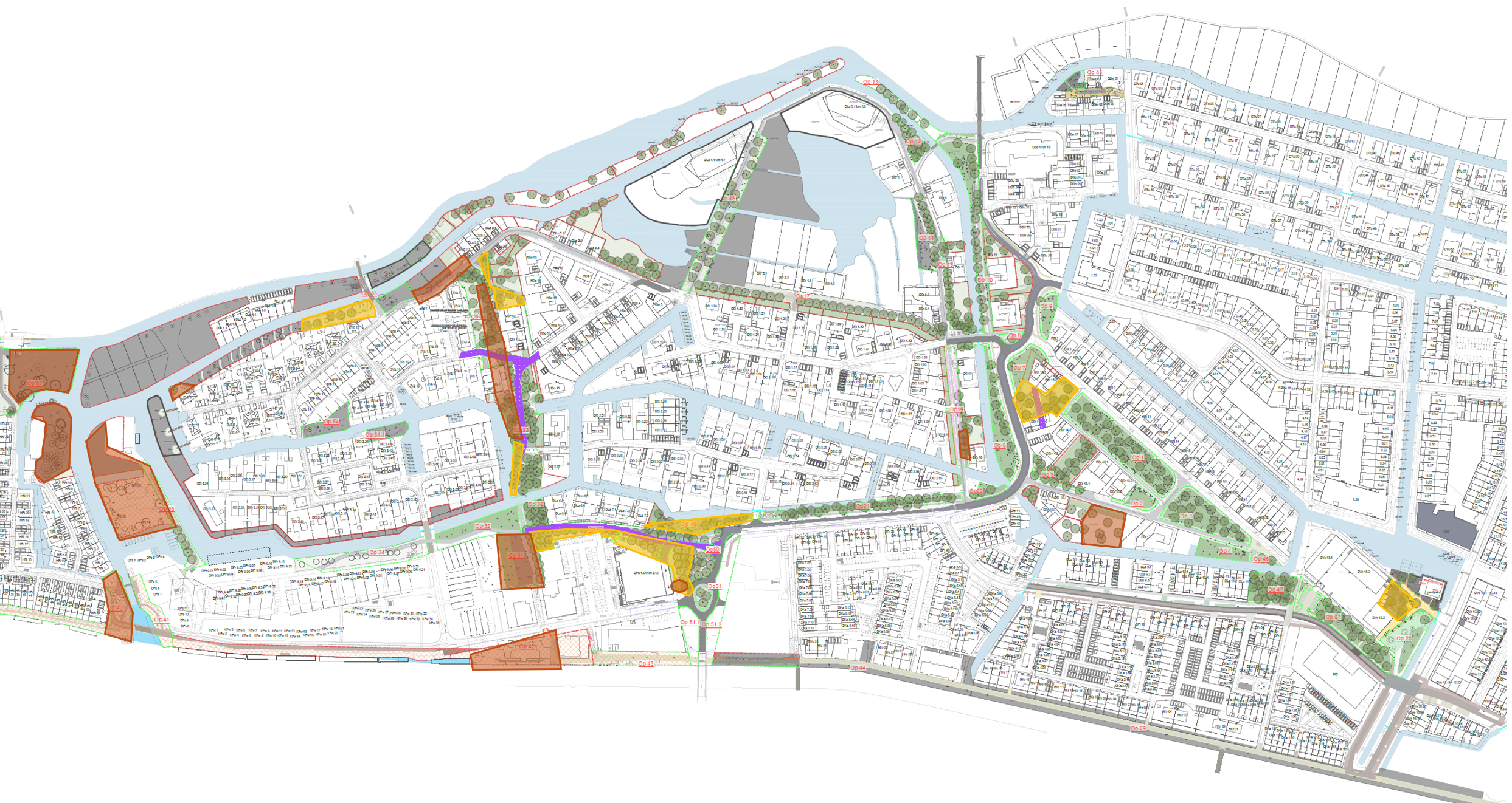 De aanplant door onze civiele aannemer Reimert start in de week van 11 november ’24 en duurt ongeveer 3 weken. Dit betreft de bomen en planten rondom (recent) aangebracht straatwerk, zie rood omrande gebieden in de onderstaande tekening.