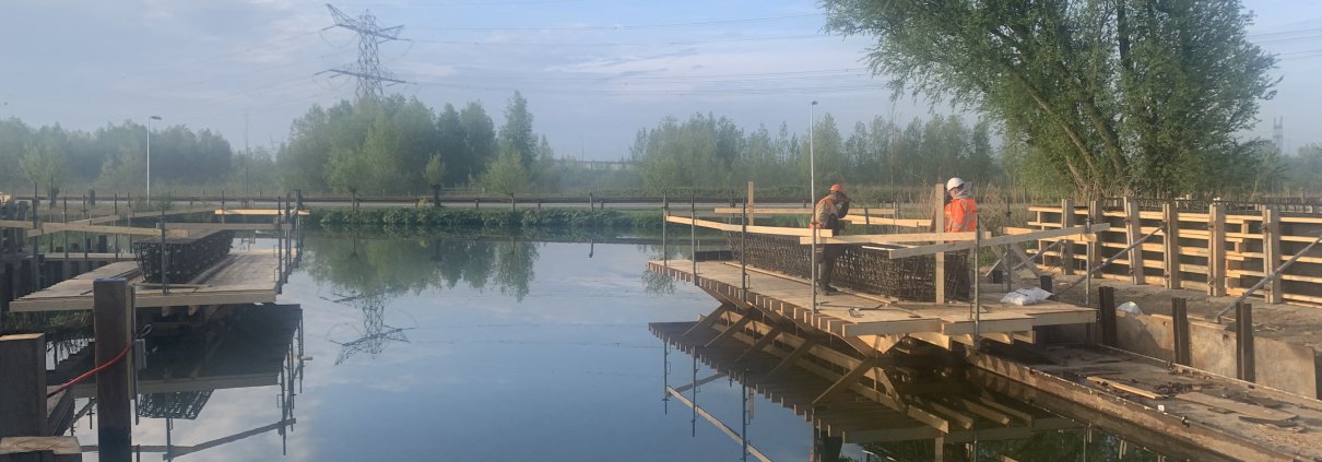 De aanleg van KW 49, de brug ten zuiden van de sluis, verloopt gestaag. Zie locatie 1 in de onderstaande afbeelding.