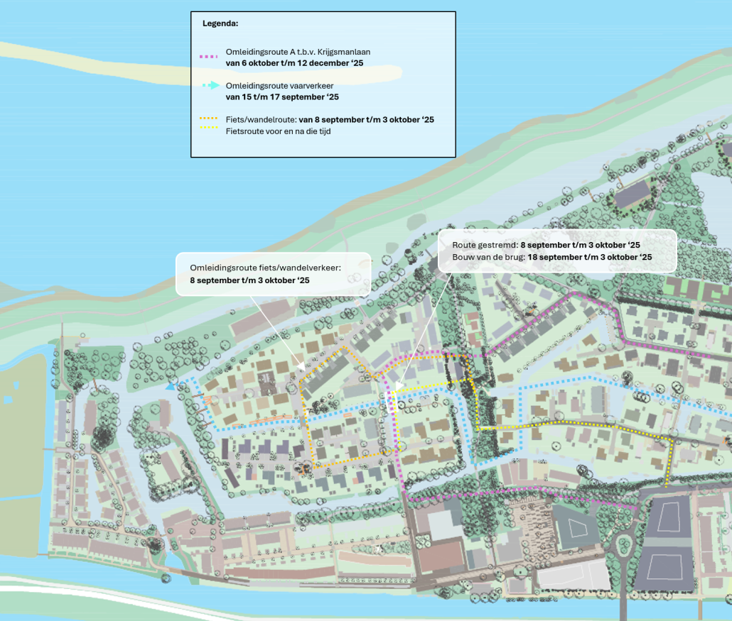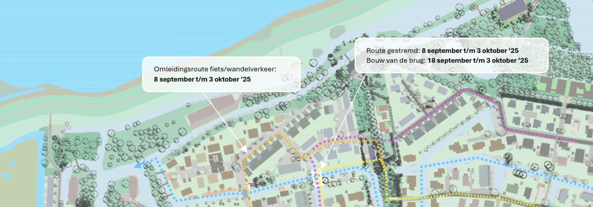 • De dam wordt in de week van 8 september ’25 ontgraven ten behoeve van een omleiding voor het vaarverkeer. Fietsers en voetgangers kunnen dan gebruik maken van de oranje omleiding zoals aangegeven in de afbeelding.