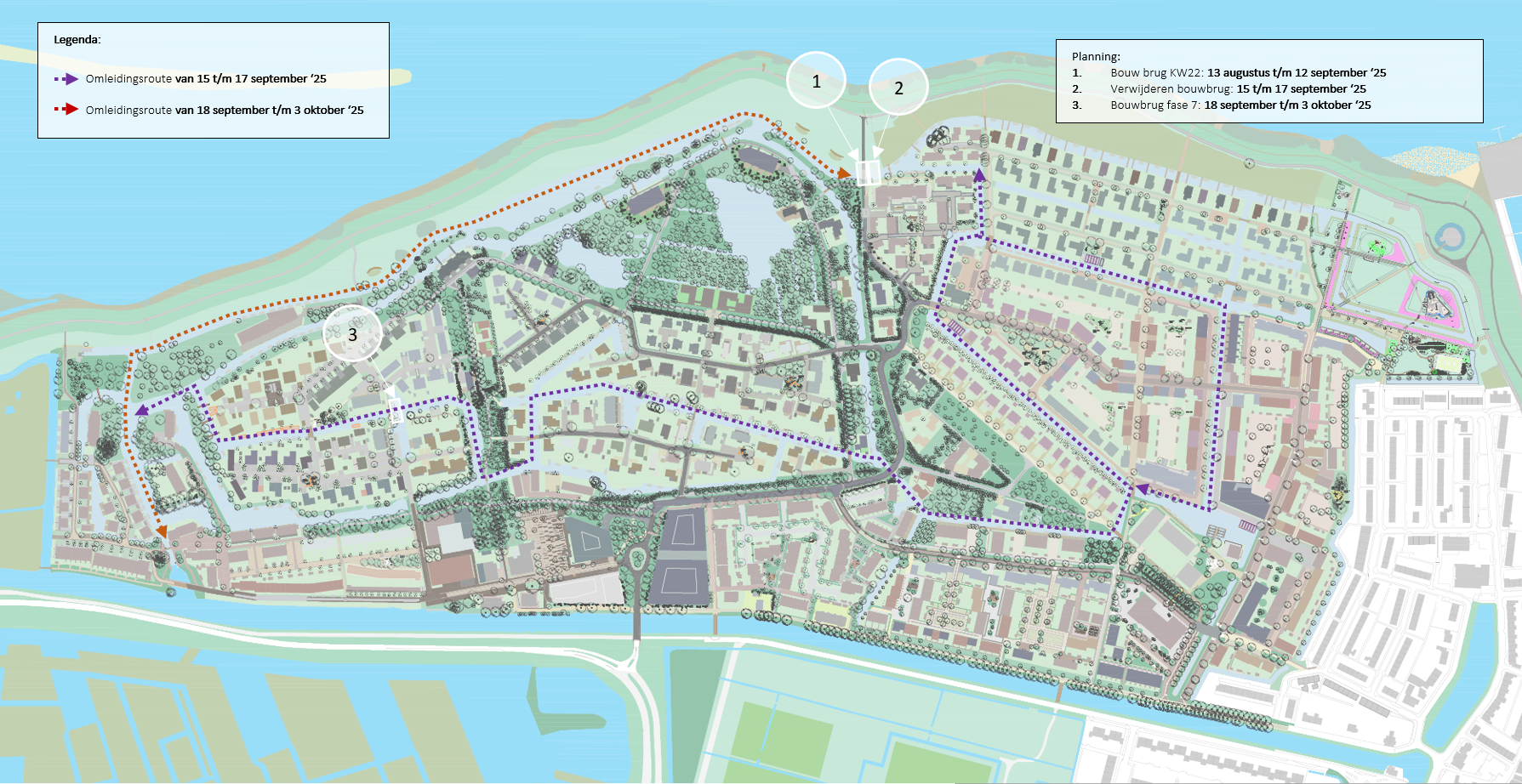 Omleiding A: Autoverkeer van en naar het gebied rondom de IJsvogel/Grote Wiel kan omrijden via het Ketelpad/fase 7/ Heksenkruid. Er worden omleidingsborden geplaatst met ‘A’. Geef deze omschrijving door aan uw bezoek of leveranciers.