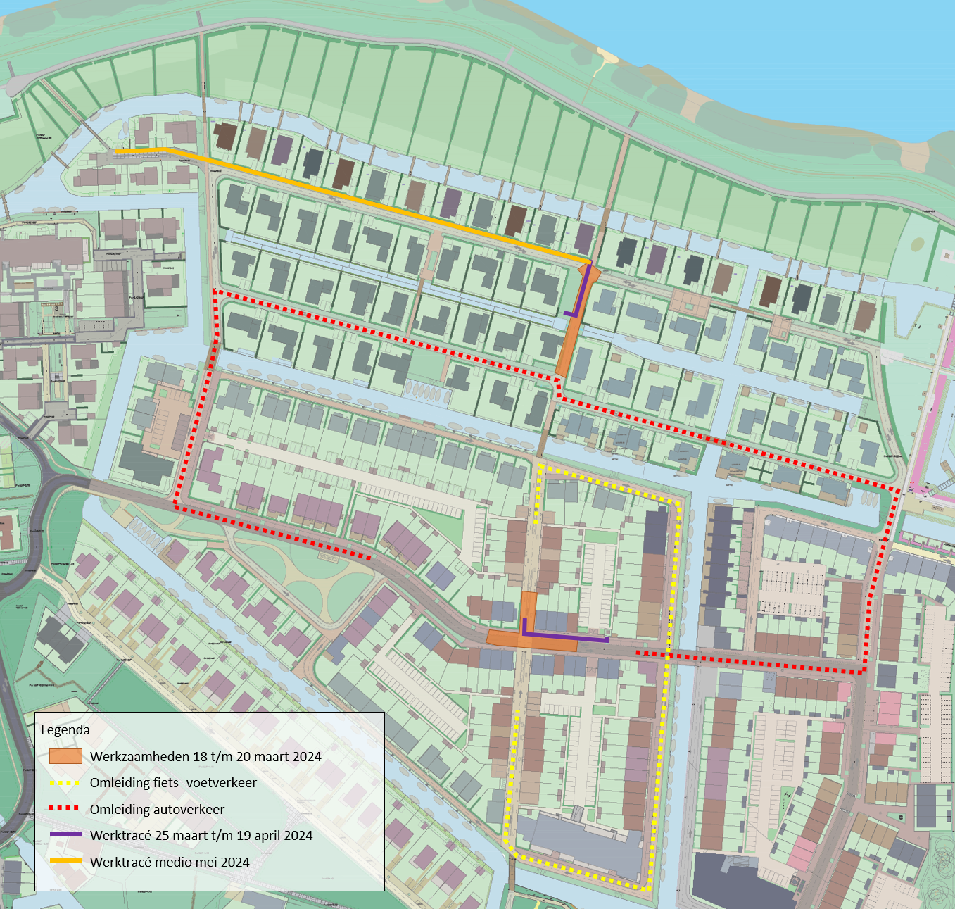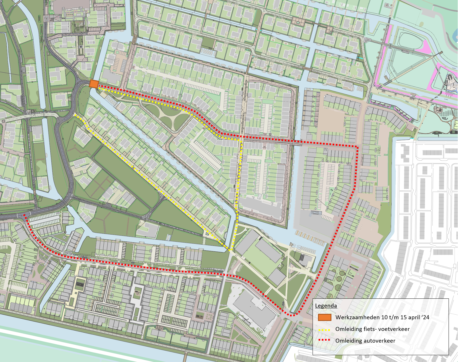 Het werkgebied is tijdens deze werkzaamheden zowel voor auto als voet-& fietsverkeer niet toegankelijk. U kunt gebruik maken van de omleidingen in de onderstaande afbeelding.